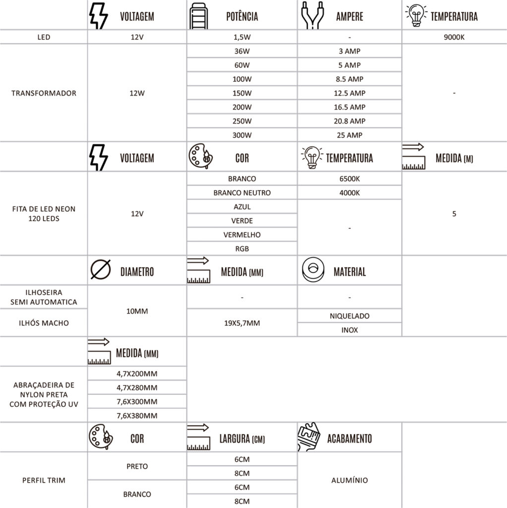 – Cor: Branco | Branco Neutro | Azul | Verde | Vermelho | RGB (com controle remoto)
