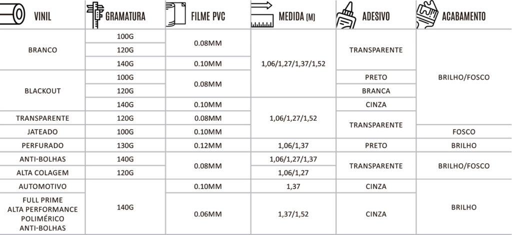 Vinis adesivos disponíveis: