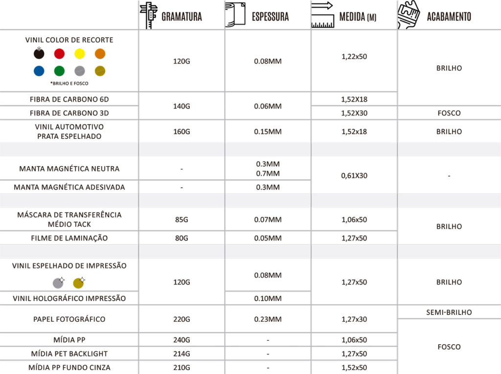 – Aderência de impressão – compatível com solvente/Eco Solvente/látex/UV; não compatível com laser ou sublimação.