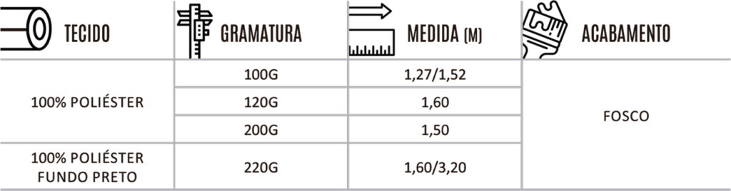 Fabricado com fibra sintética 100% poliéster, este tecido combina alta qualidade de impressão com ampla versatilidade para projetos de Comunicação Visual. Leve e macio ao toque, oferece boa resistência à tração, excelente acabamento visual e estabilidade de cor mesmo sob forte incidência de luz, além de ser uma opção ecologicamente responsável.